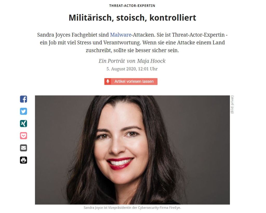 Sandra Joyce sitzt im Homeoffice im Horse Country im US-Bundesstaat Virginia. Entfernt bellt ihr Hund, die fünf Kinder sind zu Hause. Corona hat ihre tägliche Pendelstrecke stark reduziert und obwohl die Szenerie idyllischer ist als im verspiegelten Glasbau von Mandiant Threat Intelligence, bleibt ihre Arbeit nervenaufreibend. Die 42-Jährige führt als Vice President der Cybersecurityfirma Untersuchungen an, die eine gewisse Schnittmenge mit Geheimdienstaktivitäten haben. Golem-Artikel von Maja Hoock.