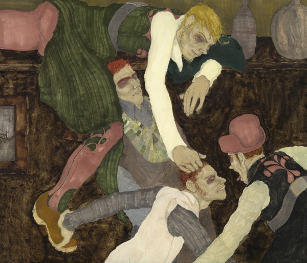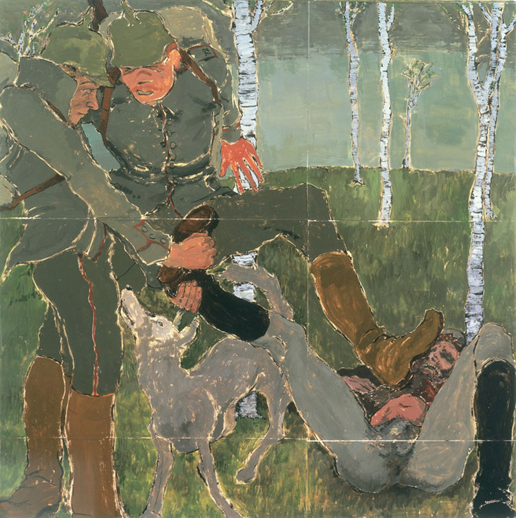 Zwei Soldaten sind es auch, die in einem anderen Bild einen dritten, am Boden liegenden Mann demütigen. Sie tragen Pickelhauben, hohe Stiefel und blassgrüne Uniformen mit roten Abnähern, und sind so als Soldaten des Ersten Weltkrieges auszumachen, wieder ein Rückgriff auf einen Männerbund in der jüngeren Vergangenheit. Die beiden stehenden Männer sind mit dem Liegenden beschäftigt; der erste zieht ihm den Stiefel aus, während der zweite den Fuß auf das Gesicht des Opfers stellt. Erneut ist die Gewaltszene eindeutig erotisch aufgeladen, denn der Mann am Boden wehrt sich wieder nicht, sondern hat den Kopf mit leicht geöffnetem Mund seitwärts gedreht und seine Arme ruhen auf dem entblößten Bauch. Er hat seine Beine weit gespreizt und legt damit den Blick auf seinen Anus und den erigierten Penis frei, der sich detailliert durch den dünnen Stoff seiner Hose abzeichnet.