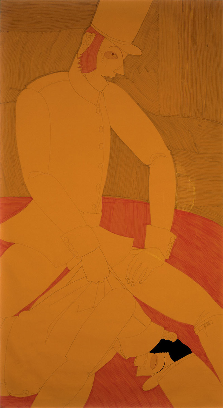 Auch in mehreren Filzstiftzeichnungen von 1998 findet man den rothaarigen Mann mit der Melone wieder, erneut mit tiefen Augenringen und einer Fantasieuniform, die eine Zugehörigkeit zu einer unbestimmten Gruppe anzeigt. Die Kleidung wirkt wie aus dem 18. Jahrhundert, der Rock ist weich-fließend und hat ein geschwungenes Muster am Rückenteil. Breitbeinig und mit geschlossenen Augen stützt sich der Mann an einen braunen Tresen, der voller runder Gefäße steht. Es ist unklar, ob er zu viel getrunken hat, ob er von der lachenden zweiten Figur im Raum geschlagen wurde, oder ob er unter seinem halbgeöffneten Mantel sexuell befriedigt wird. Ihm begegnet man auch in einer ähnlichen Szene aus derselben Serie, wieder an einem Tresen, als er mit weit geöffnetem Mund die Zunge in Richtung eines Mannes bleckt, der von einem anderen an den Haaren festgehalten wird. Der Mann mit der Melone und der Mann auf dem Tresen tragen ähnliche Uniformen und scheinen zusammen zu gehören. Der auf dem Tresen trägt rosa Leggins, die wieder das Geschlechtsteil des Mannes deutlich erkennen lassen. Er blickt fast liebevoll auf den, dessen Haare er festhält. Dieser scheint seine Misshandlung zu genießen, denn er wehrt sich nicht und hat die Augen halb geschlossen. Er reckt sich zu dem Mann mit Melone und seiner herausgestreckten Zunge, als wolle er ihn küssen und nicht, als wolle er sich schützen. Sowohl die Frisur, als auch Haarfarbe, Augenringe und Statur dieser Figur weisen bemerkenswerte Ähnlichkeiten mit Kai Althoff auf. Es könnte sein und ist sogar relativ naheliegend, dass er sich selbst in dieser zentralen Figur seines Oeuvres wiederspiegelt.