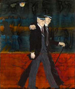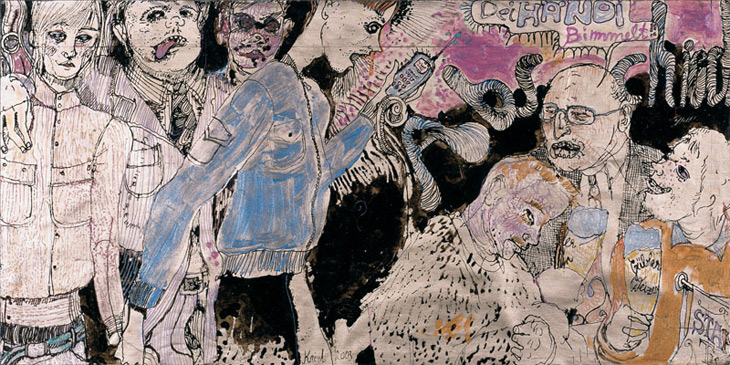 Ein Scherenschnitt von 1993 zeigt diese bierselige Stimmung an einem Polizisten in grüner Uniform und einem Bar-Besucher mit einem vollen Maßkrug in der einen, und der Schulter des Wachmannes in der anderen Hand. Die Figuren blicken sich mit halbgeöffneten Augen an und scheinen nicht mehr ganz nüchtern zu sein. Die Aussage der Arbeit könnte sein, dass man sich am Tresen eben näher kommt, selbst wenn es sich um die Staatsmacht und einen Bürger handelt, der nicht besonders vertrauenserweckend wirkt, mit seinen fettigen Haaren und den vom Alkohol rot-glühenden Wangen. Daraus spricht ein gewisser Ekel vor der Distanzlosigkeit, stumpfen Kumpanei und blinden Verbrüderung im Voll-Suff.