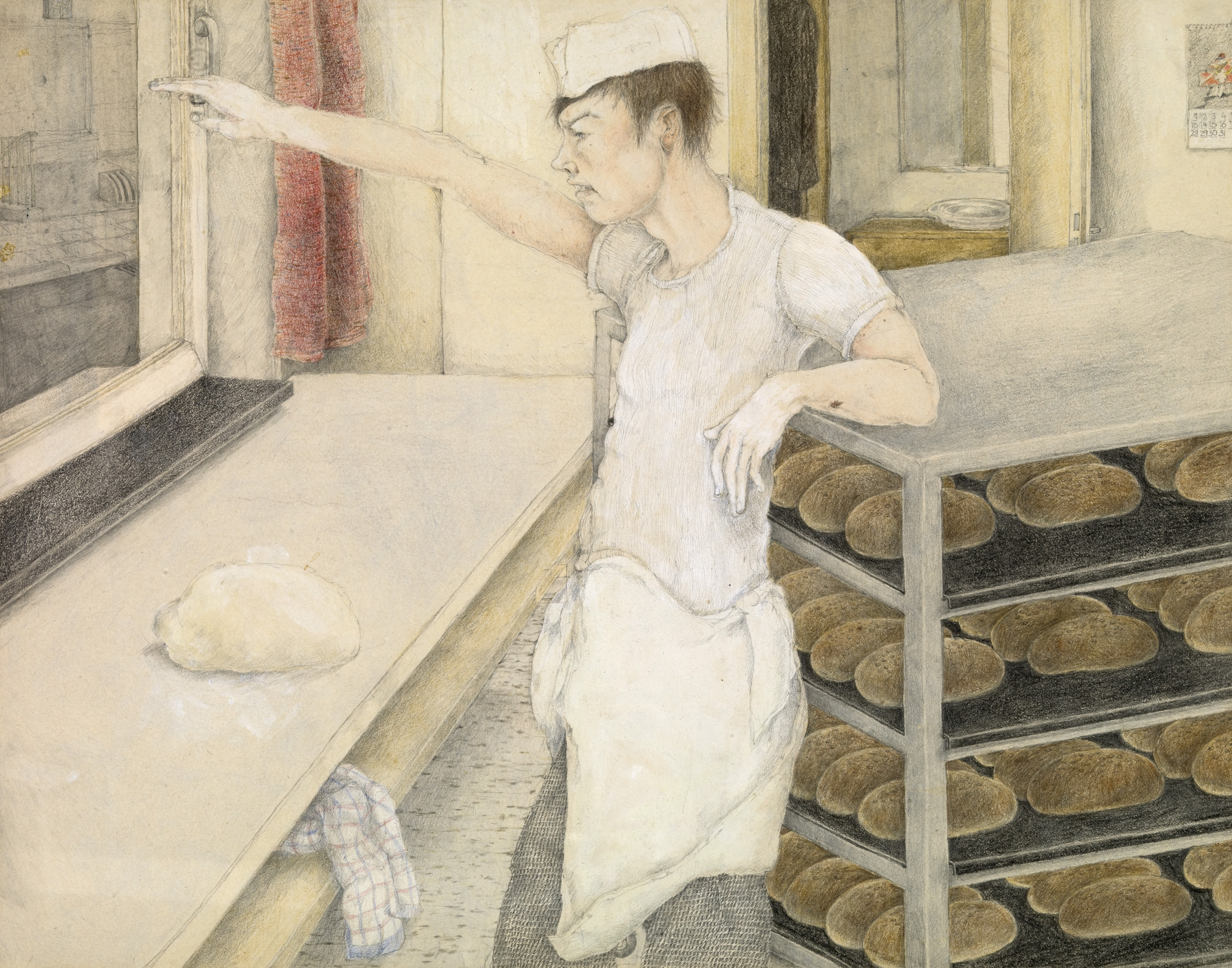 Da blickt ein Handwerker auf der Walz verträumt aus dem Zugfenster auf die vorbeiziehenden Häuser und umschließt dabei mit einer Hand eine rot-grün-weiße Flagge mit Eichel-Blättern, vielleicht die Fahne seiner Heimatregion. Er lächelt stolz und löst beim Betrachter schnell unangenehme Assoziationen aus, die an Nazi-Kultur denken lassen. Ein ähnlich stolzes Lächeln wie hier findet man auch im zweiten Bild der Serie mit drei Buntstiftzeichnungen von 1994: Ein blond-gescheitelter Zimmermann steht mit den Händen in den Hüften vor Fachwerkhäusern, die er mitgebaut haben könnte und strahlt mit seinem zufriedenen Blick fast trotzigen Stolz auf sein Handwerk und seine Kultur aus. Deutlicher stellt Althoff diese politische Gesinnung der Figuren im dritten Part der Serie dar: Ein Bäcker lehnt sich an das Regal mit seinen frisch gebackenen Broten, während er aus dem Fenster zu schimpfen scheint und seinen rechten Arm zum Hitlergruß ausgestreckt hat. Althoff spielt mit dem Gefühl von Heimatverbundenheit und dem schmalen Grat zwischen Stolz auf die eigene Herkunft und Hass auf alles Fremde. Seine Figuren sind rechtschaffende Bürger, die einen „ehrlichen“ Handwerksberuf betreiben, im anderen Moment aber genauso Angst haben, Ausländer könnten ihnen den Job klauen. Darauf weist auch der Titel der Serie „Auf guten Rat folgt Missetat“ hin; aus etwas eigentlich Gutem folgt etwas Schlechtes, Gewalttätiges und gleichzeitig Anziehendes. „[In der Serie, in der] junge Handwerksgesellen, die wie romantische Märchenfiguren aussehen, reaktionäre Gesinnungen entäußern, stellt Althoff eine Verbindung her zwischen homosozialen Gemeinschaften, deren Zusammenkünften etwas Bedrohliches anhaftet, jugendlicher Delinquenz, die erotisch aufgeladen ist, und dem ‚Ultra-Bösen‘, der Nazi-Symbolik.“